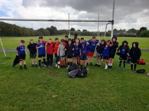 The referee just through it up Tyler has a strong run up and they’re on the attack and James’ with the free and with an attempt to score, ooh it goes wide, Jayden kicks it out and with an attack. S.M.G.S. have just scored a point! And one of our younger players Jack Mulrany scored it. Just had another attack they repel it Emmet with a few attacks there was no goal though. Jayden’s kick and we are attacking, James’ trying to defend and they repel it. It’s back up our end and Jayden fell and now one of our other players Danny has just been taken down.