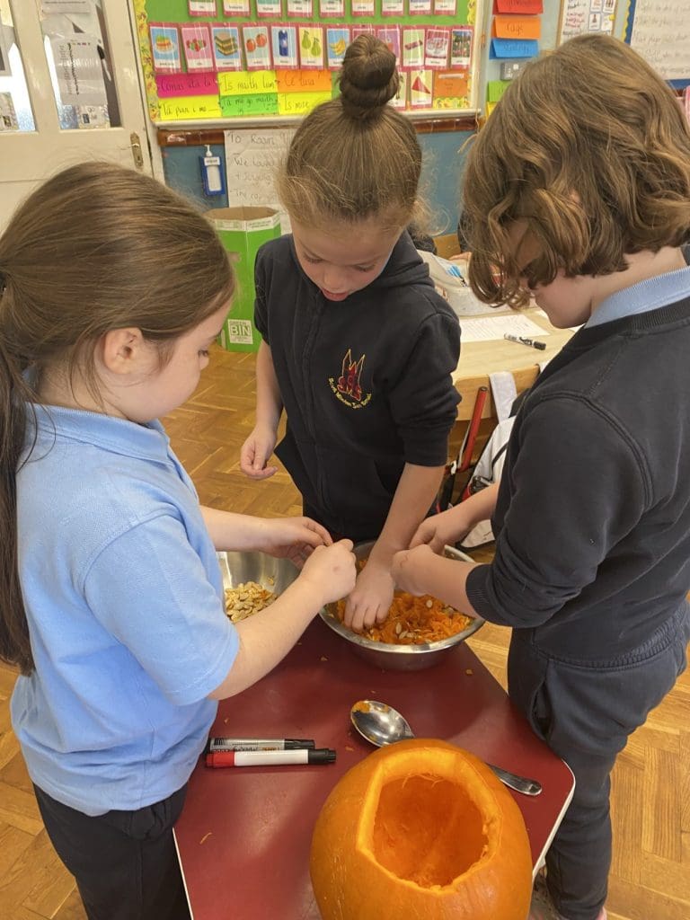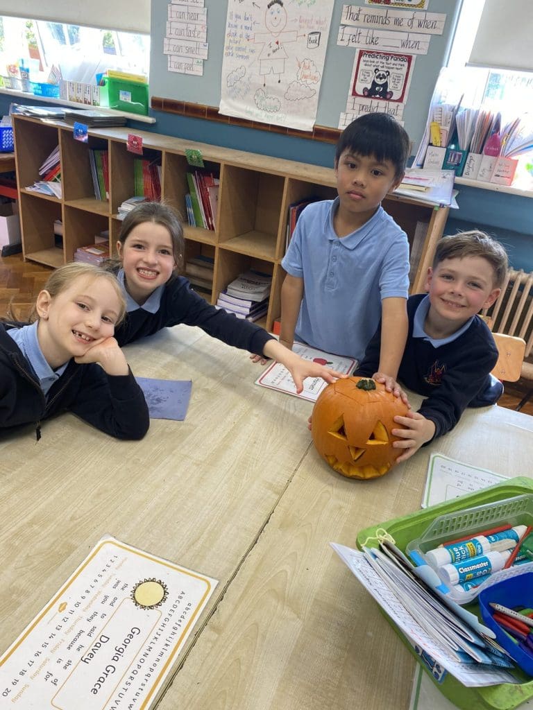 We are learning to write procedures in Room 9 this month. Today we carved a pumpkin and we wrote the procedure together step by step. We roasted the pumpkin seeds and tasted them, they were delicious! We have named our pumpkin Jeremy and he looks great in our classroom for Halloween!