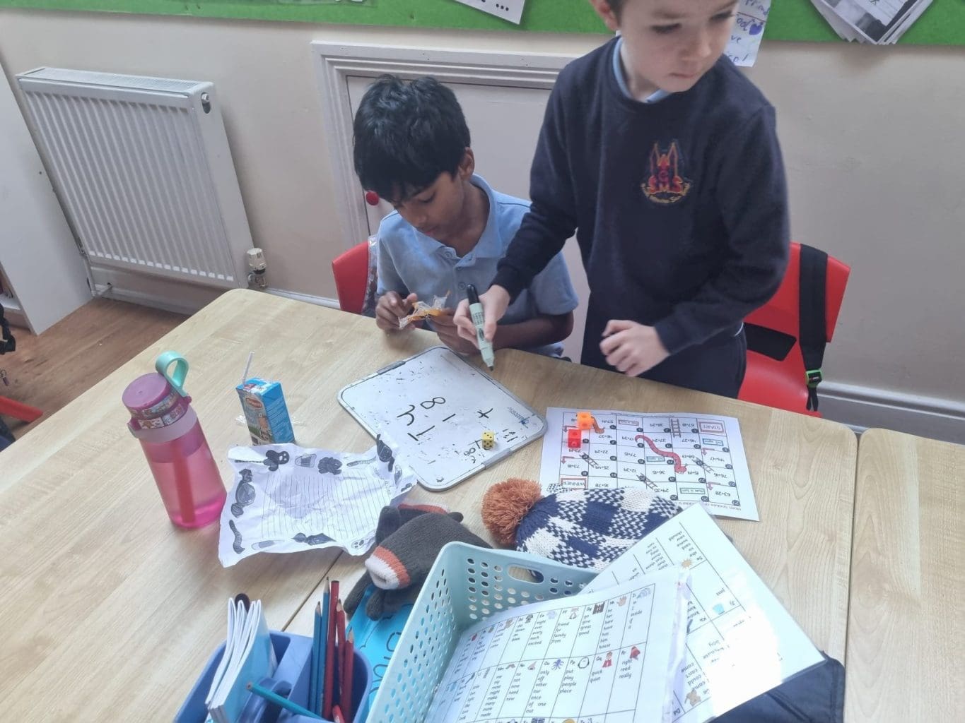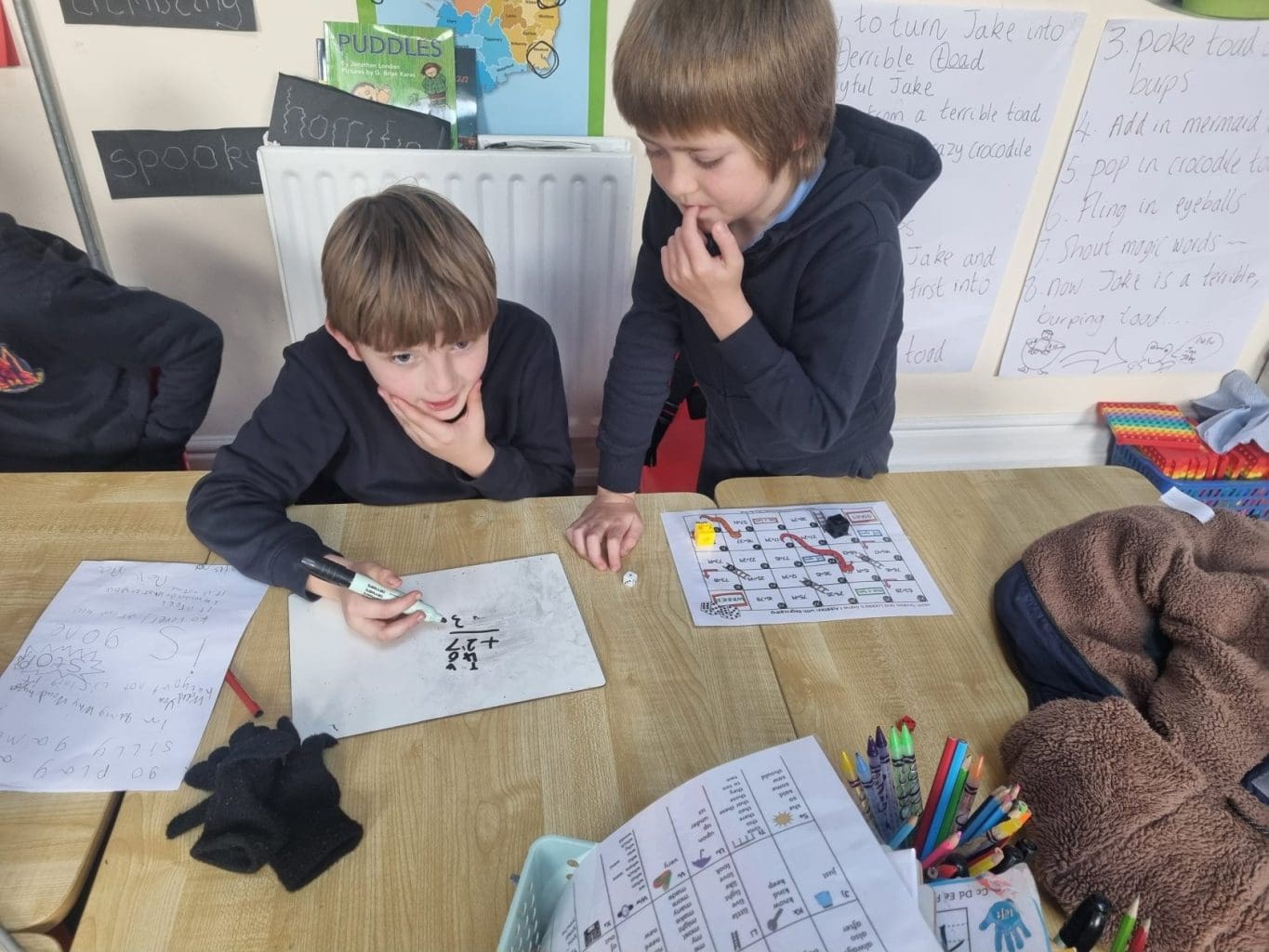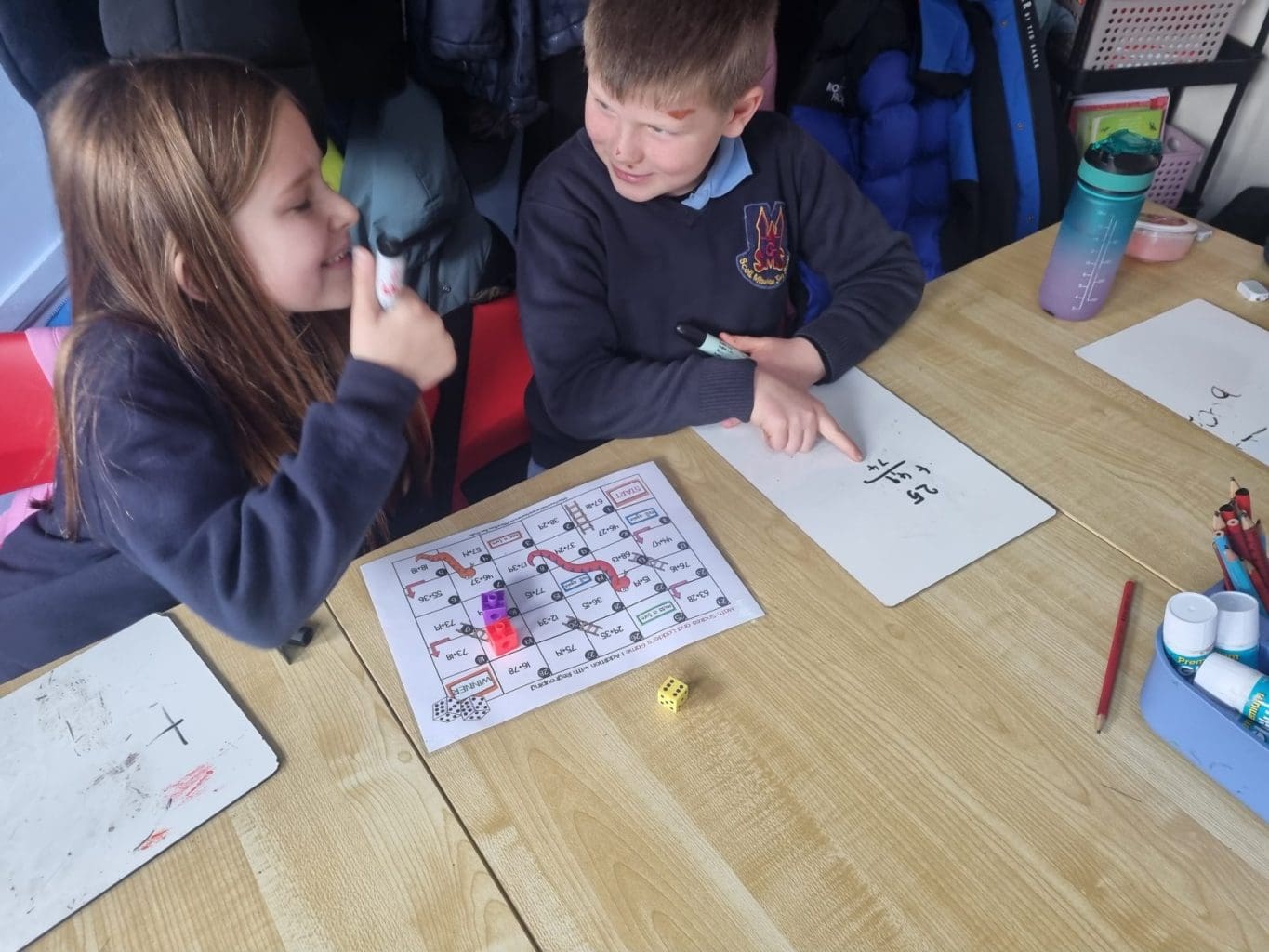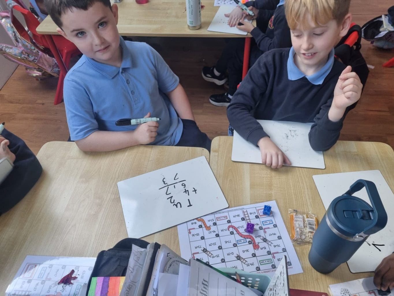 We are busy practicing our addition skills in Room 7 with tricky snakes and ladders!