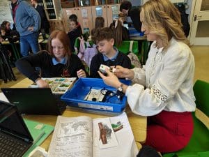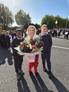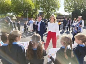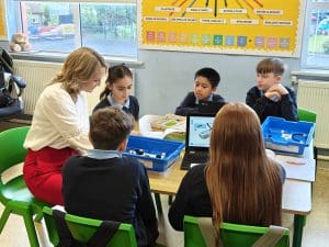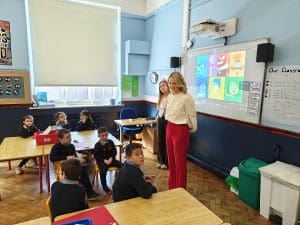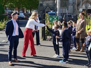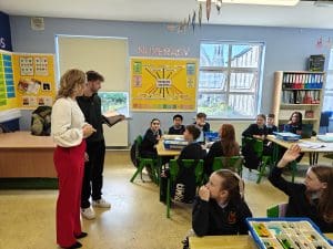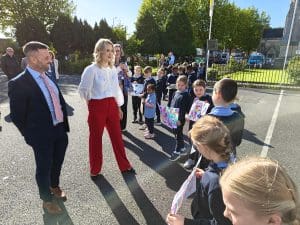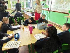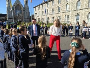 Ms. McEntee was greeted by Principal Mr. Gough, and all the pupils in 2nd, 3rd & 4th class. She also visited Ms Mc Intyre’s 1st class as well as both 6th classes to witness the new curriculum in action. Ms. Mc Intyre was teaching wellbeing, Mr Moynihan was teaching STEM & geography whislt Juliette Saumande was in Mr. Lacey’s class teaching French.